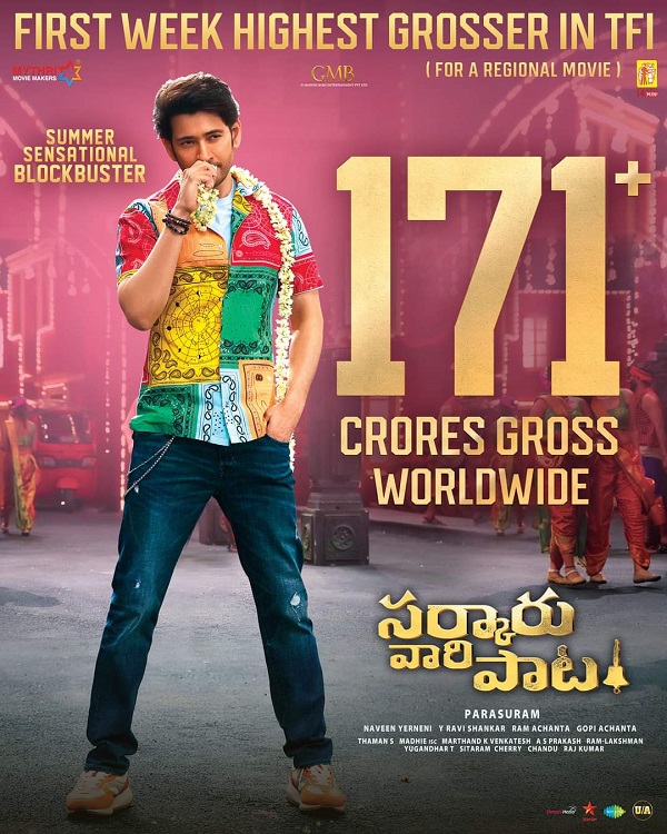 വേഗത്തില് 100 കോടി പിന്നിട്ട തെലുങ്ക് ചിത്രമായി മാറി മഹേഷ് ബാബു- കീര്ത്തി സുരേഷ് ചിത്രം 'സര്കാരു വാരി പാട്ട'. ആദ്യ ദിവസം തന്നെ 75 കോടി സ്വന്തമാക്കി തുടങ്ങിയ യാത്ര തുടരുകയാണ് ഇപ്പോഴും.മെയ് 12ന് റിലീസ് ചെയ്ത ചിത്രത്തിന് മികച്ച പ്രതികരണമാണ് ലഭിക്കുന്നത്.