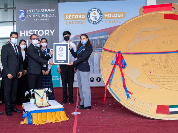കോവിഡ് മാനദണ്ഡങ്ങള് പാലിച്ച് ശനിയാഴ്ച രാവിലെ സ്കൂളിലെ പ്രധാന ലോബിയില് പ്രദര്ശിപ്പിച്ചാണ് മെഡല് ഗിന്നസ് അധികൃതര് അളന്നത്. സ്കൂള് പ്രിന്സിപ്പല് ഡോ. ബെനോ കുര്യന്റെ നേതൃത്വത്തില് വിദ്യാര്ഥികള്, അധ്യാപകര്, രക്ഷിതാക്കള്, ജീവനക്കാര്, സ്കൂള് മാനേജിങ് ഡയറക്ടര് മുനീര് അന്സാരി എന്നിവര് പരിപാടിയില് പങ്കാളികളായി. ഒബൈദ് അല് കെത്ബി നേടിയ ഗിന്നസ് റെക്കോഡിനെ പുതിയ മെഡല് മറികടന്നതായി ഗിന്നസ് പ്രതിനിധി കാന്സി എല്. ഡിഫ്രാവി പ്രഖ്യാപിച്ചു. നീണ്ട ഹര്ഷാരവത്തോടെയാണ് സ്കൂളിലെ വിദ്യാര്ഥികളും ജീവനക്കാരും പ്രയത്നത്തിനു ലഭിച്ച അംഗീകാര പ്രഖ്യാപനത്തെ സ്വീകരിച്ചത്.